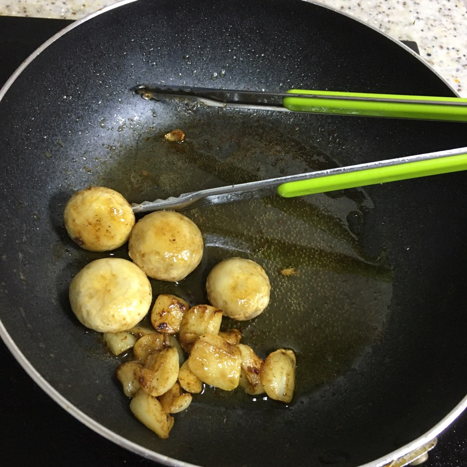 8) 3분 정도(5~6번쯤 뒤집었을 때) 살짝 으깬 마늘과 양송이버섯을 넣고 같이 구워줍니다. (30초 뒤집기는 잊지 마세요!)